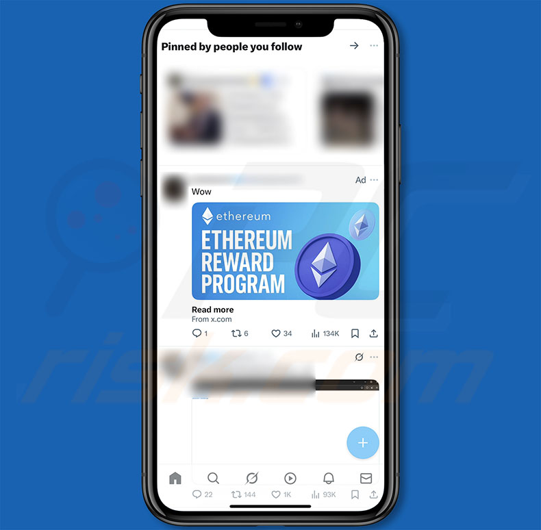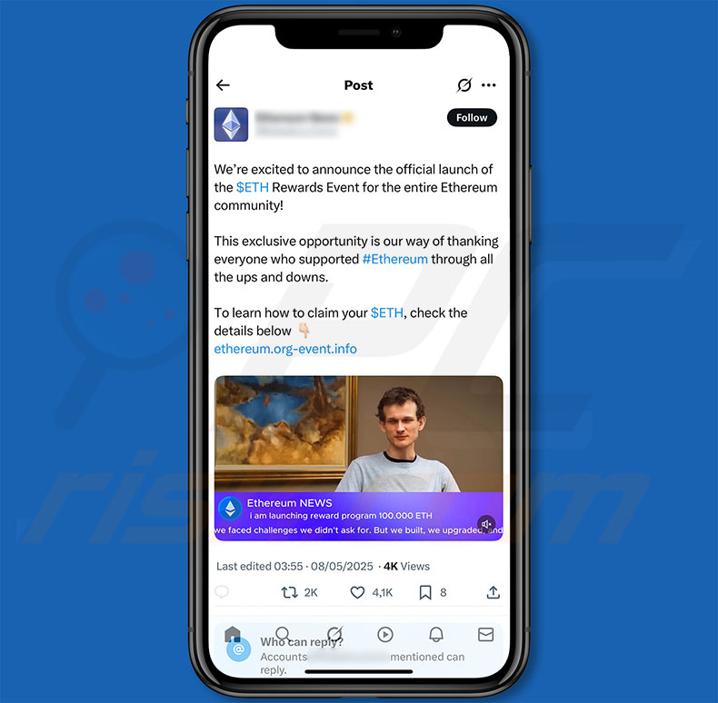 Der Betrug „Ethereum (ETH) Reward Program" wurde über Social-Media-Spam verbreitet – irreführende X-Beiträge (auf der Plattform, die früher Twitter hieß, besser bekannt als „Tweets").