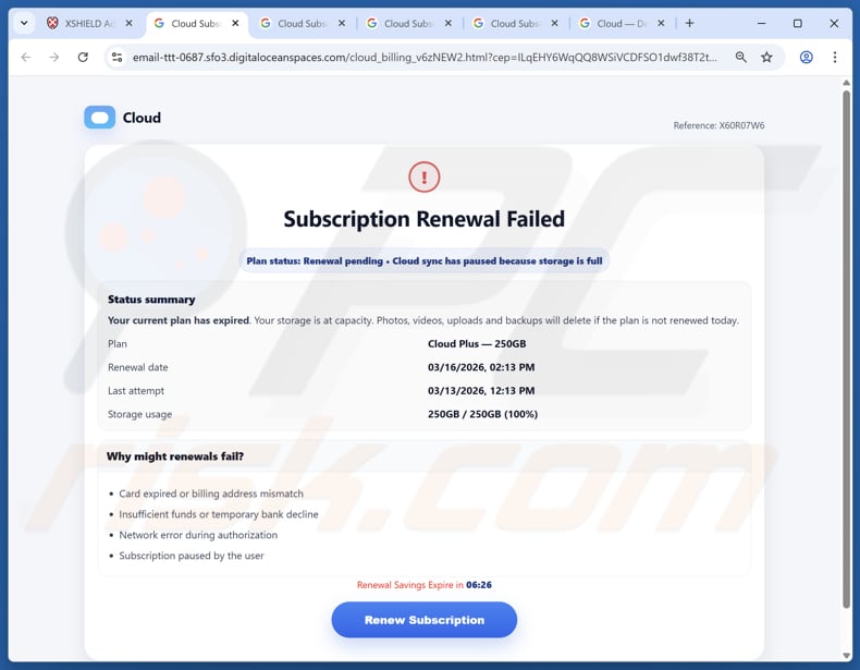 Der Zweck dieser betrügerischen E-Mail besteht darin, die Empfänger dazu zu verleiten, auf den angegebenen Link zu klicken, der zu gefälschten Websites führt. Diese Websites sind so gestaltet, dass sie wie seriöse Portale für Cloud-Speicher oder Abonnementverwaltung aussehen. Sie behaupten, der Speicherplatz des Nutzers sei voll oder die Verlängerung eines Abonnements sei fehlgeschlagen, warnen davor, dass Backups oder Uploads unterbrochen seien, und drohen mit Datenverlust, falls die Zahlungsdaten nicht umgehend aktualisiert würden.